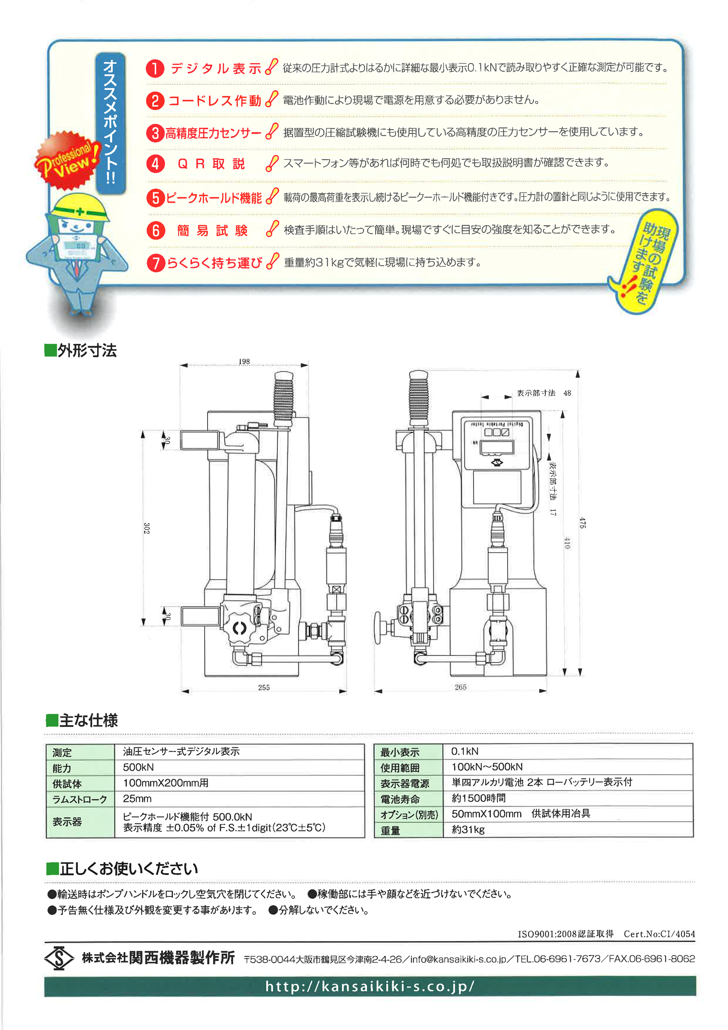 従来の圧力計式よりはるかに詳細な最小表示0.1kNで読み取りやすく正確な測定が可能です。